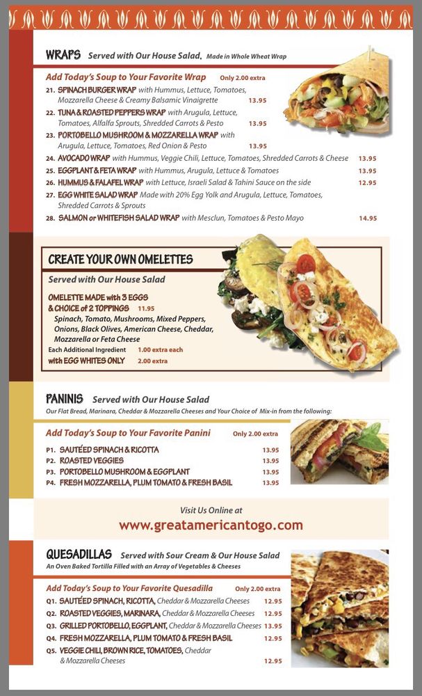 Served with a side salad or home fries. Made with 3 eggs and a choice of 2 mix-ins. Additional mix-ins for an additional charge. Make it with egg whites only for an additional charge.