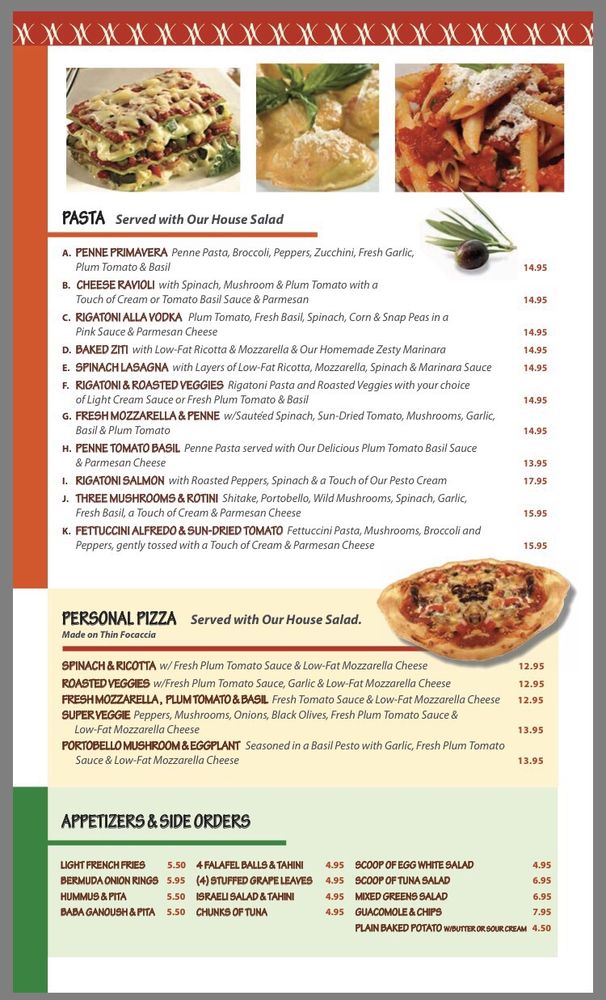 Served with tangy tomato sauce or mushroom basil cream sauce. Served with 2 side dishes.