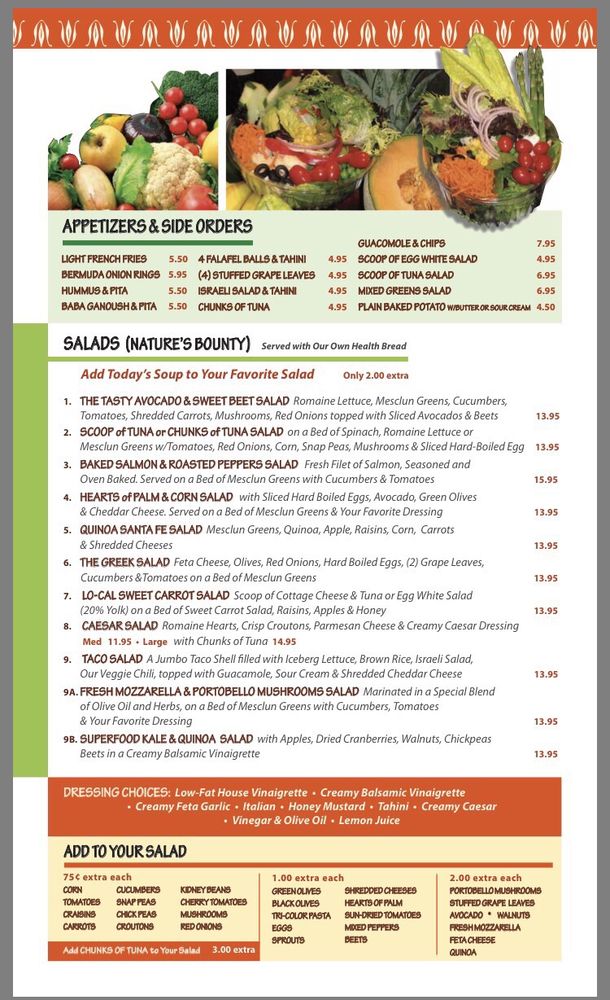 Fresh salad with a variety of green vegetables typically served on a bed of lettuce. Choice of dressing.