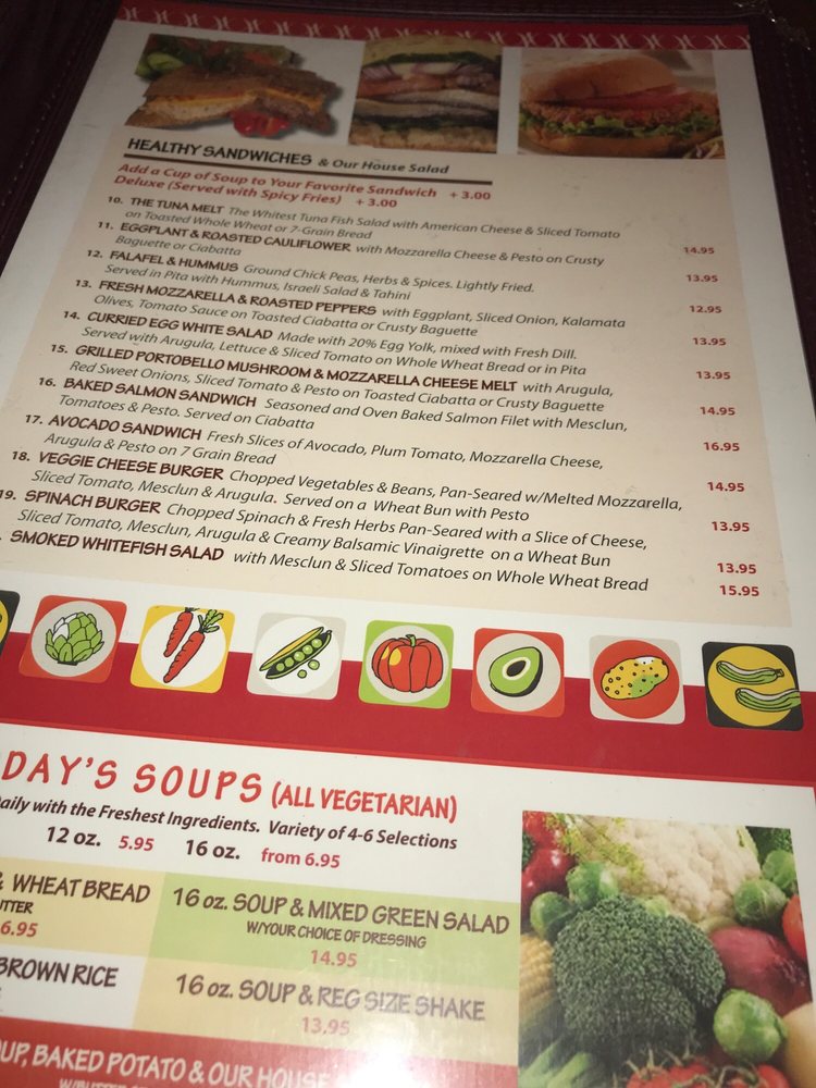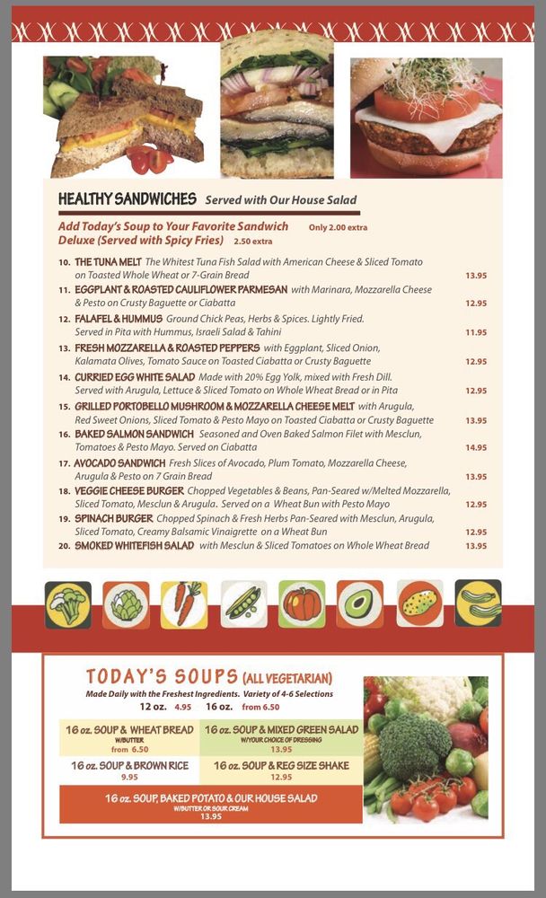 A patty of chopped vegetables and beans, pan-seared. Served with American cheese, sliced tomato, mesclun greens and spicy mayo on a toasted pesto wheat bun.